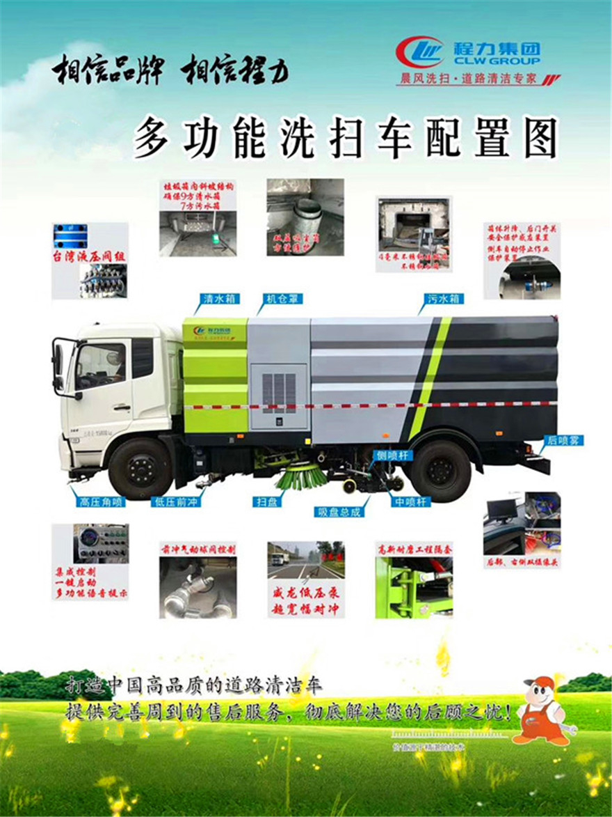12. 車廂尾部帶可調節的霧狀噴水桿,在節約水的同時消除二次污染及美化路面的效果。