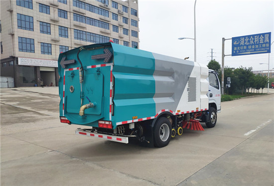 該洗掃車采用國六東風(fēng)多利卡二類底盤改裝,加裝副發(fā)動(dòng)機(jī)、風(fēng)機(jī)、清水箱、垃圾箱、左右立掃、掃盤降塵系統(tǒng)、左右高壓側(cè)噴高、吸盤內(nèi)置高壓主噴桿、氣動(dòng)系統(tǒng)、液壓系統(tǒng)、專用裝置電控系統(tǒng)和副車架等改裝而成。