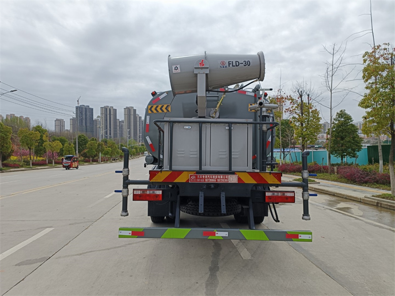 東風15-16噸霧炮灑水車產品標配前噴(鴨嘴)、后沖、后灑、側噴、后置式工作 平臺,平臺上配置綠化水炮(可 360°旋轉,既可以調成柱狀,也可 以調成霧狀,更可以調成直沖狀、大雨、中雨、小雨、毛毛雨),配 備優質大功率專用灑水泵(可自吸自排,可從河里或池塘抽水到罐體), 取力器,雜物過濾網,消防接口,自流球閥系統、取力器、球閥、濾網 均為國家標準產品,主管道加粗,法蘭墊、法蘭盤加厚,大通徑球閥。 整體具備性能優良安全可靠、效率高、流量大、維修方便等特點